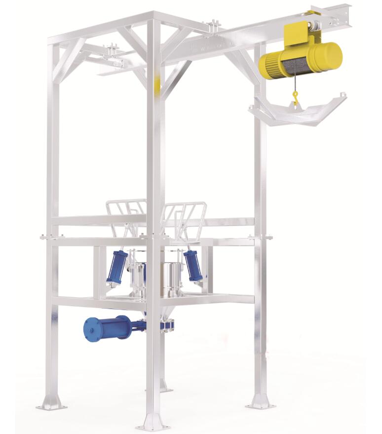 由提升機將噸袋提升至設備的進料口,由破袋機打開噸袋下料口,將噸袋內物料導入下料口,打開振動裝置震動輔助下料,促進噸袋內的物料靠重力進入攪拌機或輸送皮帶,卸料完成后,吊出空袋,來完成整個拆包卸料過程。